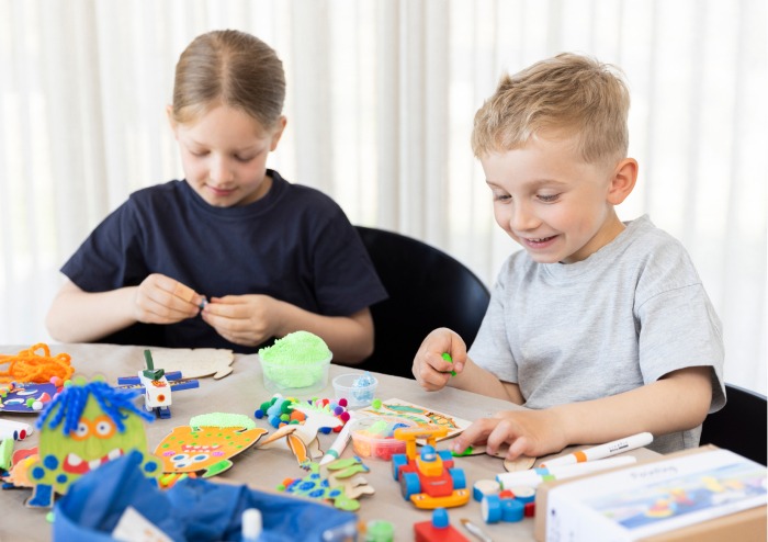 Für etwas ältere Kinder lässt sich die Textildekoration durch kleine Details wie Filz, Glitzermasse, Glitter und andere dekorative Elemente erweitern, mit denen sie mit Struktur und Oberfläche spielen können. So fördert Textildekoration Kreativität, Feinmotorik und Selbstvertrauen – im ganz eigenen Tempo des Kindes.